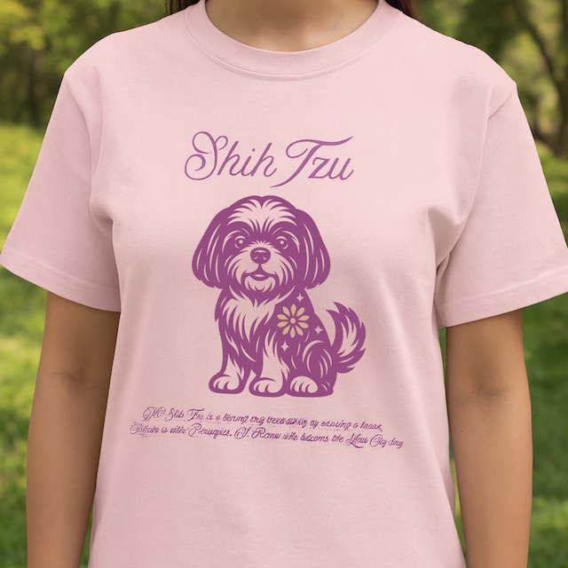 # ベーシックTシャツ|シー ズー【Blooming Shih Tzu】P(全52色) ■あなたのスタイルを引き立てるベーシックTシャツ! このベーシックTシャツは、チャーミングなシー ズーが花と共にデザインされたアイテムで、シンプルながらも魅力的なスタイルを演出します。柔らかなコットン素材を使用しているため、肌触りがよく、日常使いや特別なお出かけにぴったりです。このTシャツを着ることで、あなたの個性を一層引き立ててみませんか? ■シー ズーと花のデザインで心を惹きつける! シー ズーの愛らしい姿と美しい花々が描かれたこのTシャツは、周囲の視線を集めることうけあいです。特別な日やカジュアルなお出かけには、この魅力的なベーシックTシャツがあなたのスタイルを一層引き立て、心温まるひとときを演出します。 ■多彩なシーンで大活躍! 日常のコーディネートや友人との集まり、休日のお出かけなど、さまざまなシーンで大活躍します。全52色の豊富なカラーバリエーションが特長で、あなたのファッションに合わせて選ぶ楽しさも広がります。ぜひ、このベーシックTシャツで新たなスタイルを楽しんでみてはいかがでしょうか?あなたの日常の必需品となること間違いありません!