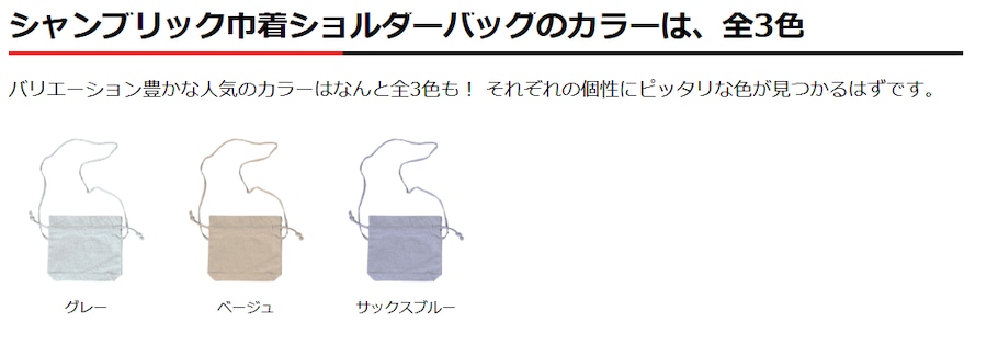 カジュアルな日常使いや旅行、フェスティバルなど、さまざまなシーンで大活躍することが期待できます。全3色の豊富なカラーバリエーションが特長で、あなたの個性やファッションに合わせて選ぶ楽しさがあります。ぜひ、このシャンブリック巾着ショルダーバッグで新しいライフスタイルを見いだしてみてはいかがでしょうか?あなたの生活の必需品になること、間違いありません!